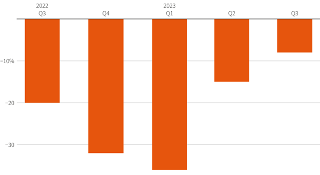 图:英特尔2022年Q3至2023年Q3季度收入降幅趋缓(美国通用会计准则GAAP)